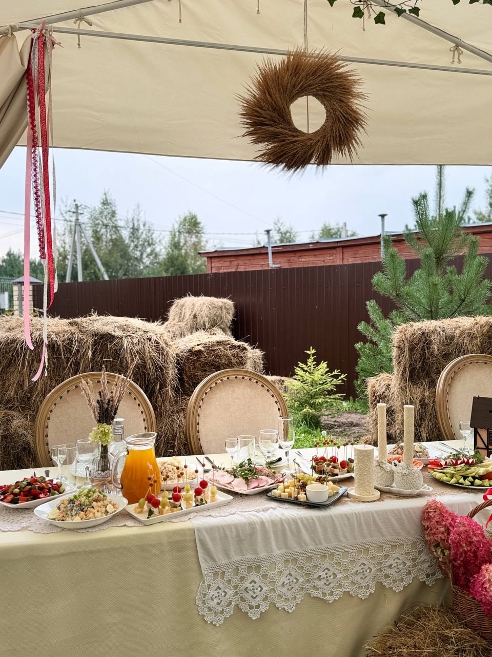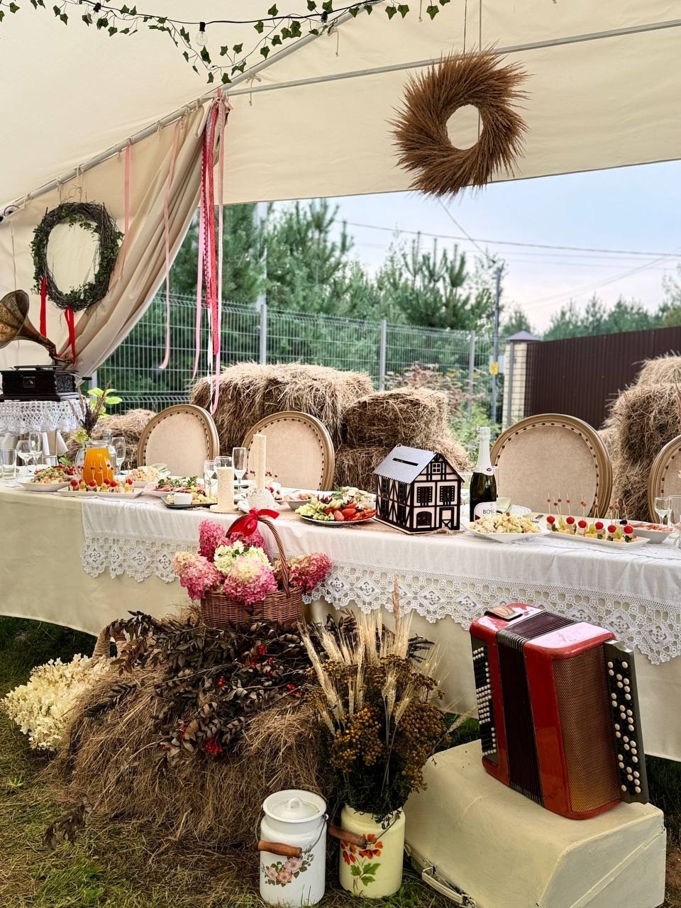 Уютные декорации: добрый деревенский баян, душистое сено и потрясающие композиции из полевых цветов и сухоцветов.